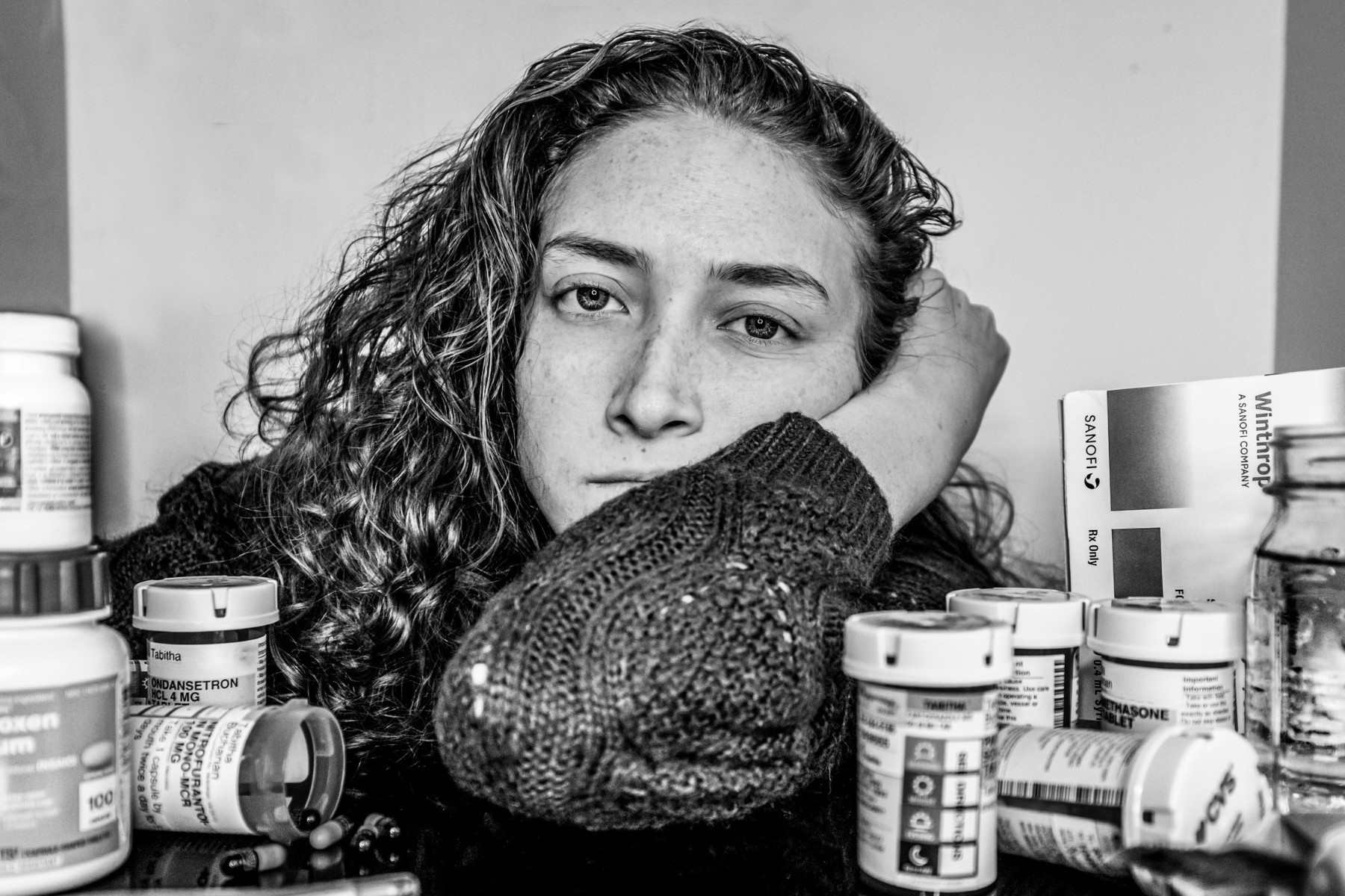 This self-portrait captures the emotional and physical weight of starting chemotherapy treatments while already living with chronic illness. Surrounded by bottles, labels, and prescriptions on her bedside table, she sits overwhelmed by the flood of new medications and the uncertainty they bring. The image reflects the isolating, relentless routine of medical management and the constant search for relief that never fully arrives. It speaks to the invisibility of suffering, the exhaustion of self-advocacy, and the erosion of identity that illness often demands.